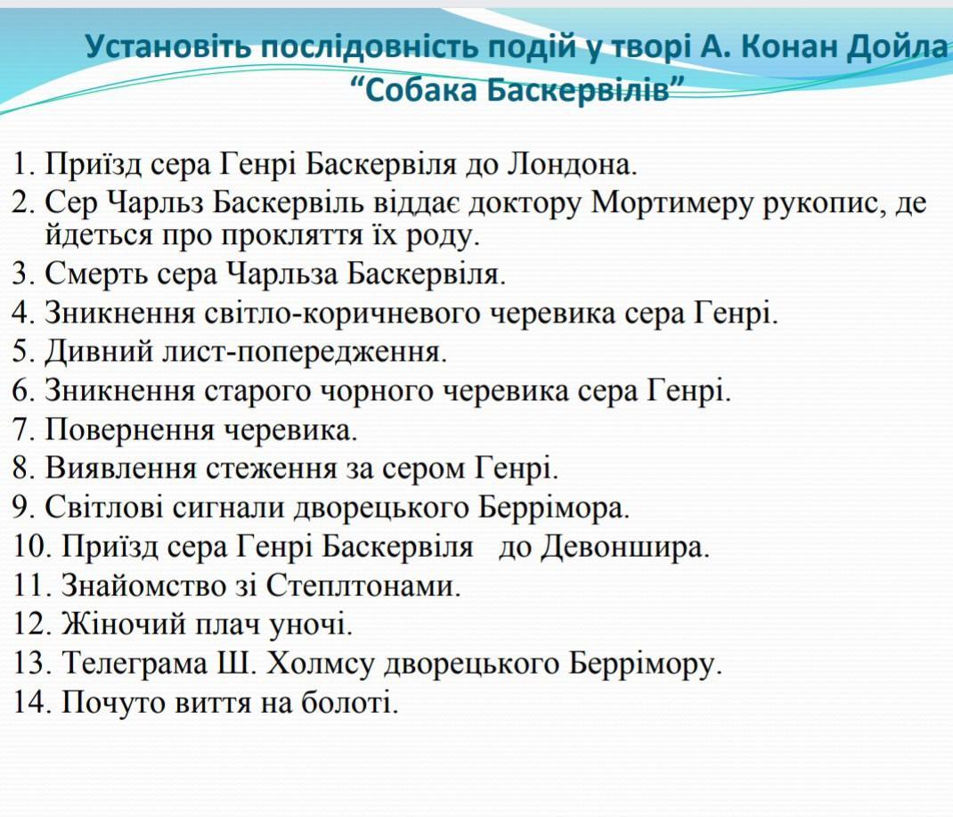 Допоможіть будь ласка !! Установіть послідовність подій у творі "Собака Баскервілів "