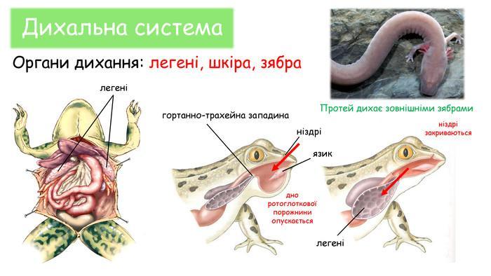 Дихання відбувається за допомогою шкіри та органів дихальної системи: парних мішкоподібних легенів та дихальних шляхів (ніздрі, ротоглоткова порожнина, трахейно-гортанна камера). Земноводним властиві 4 способи дихання: шкірне, ротове (дифузія через ротовий епітелій) легеневе і зяброве, які доповнюють один одного.