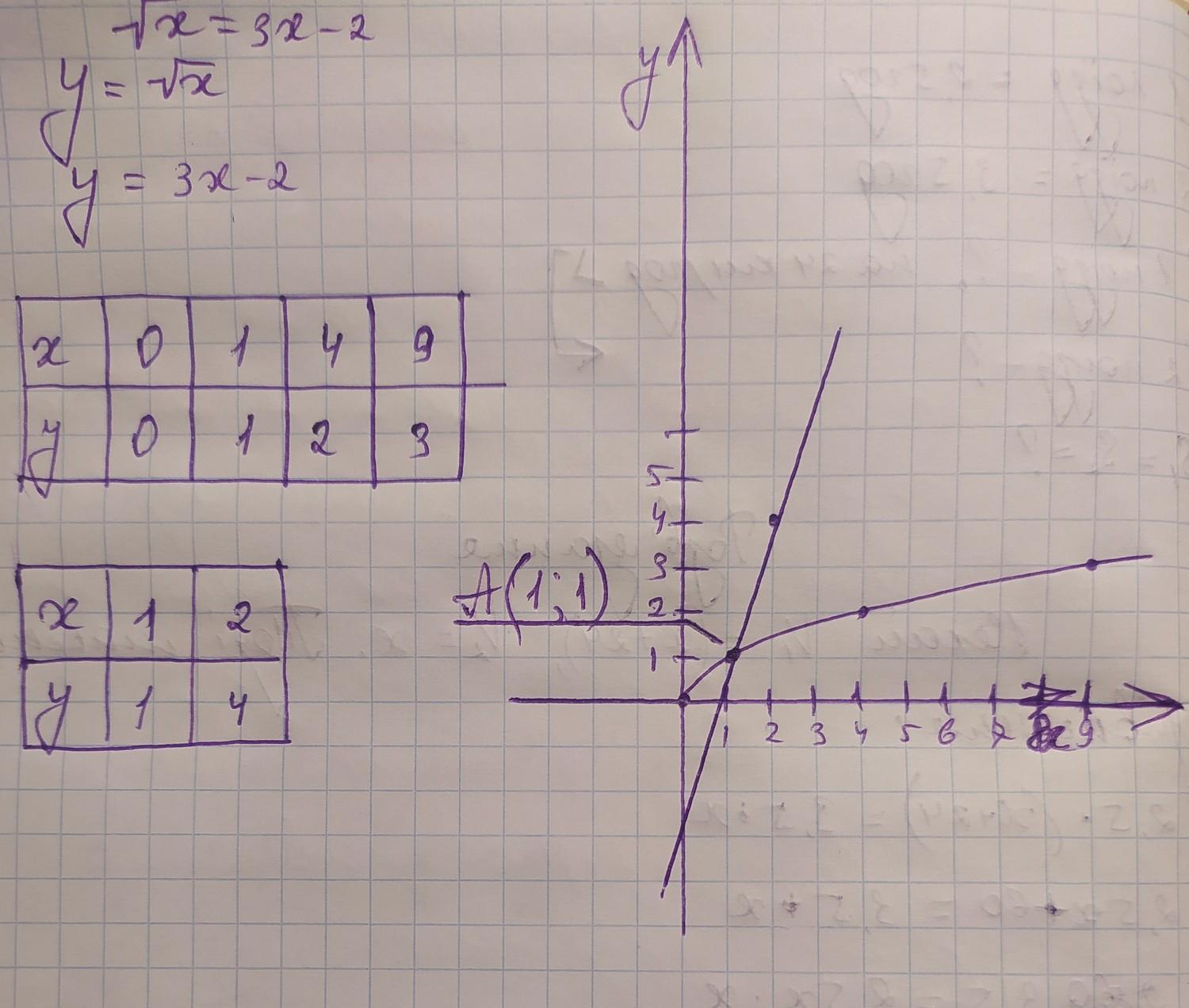Для того, щоб графічно розв'язати це рівняння, треба спочатку побудувати графік функцій y=√x і y=3x-2, а потім знайти точку їх перетину.