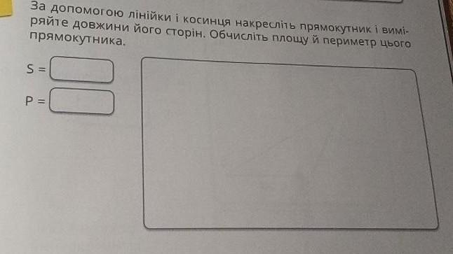 За допомогою лінійки і косинця накресліть прямокутник і вимі- ряйте довжини його сторін. Обчисліть площу й периметр цього прямокутника. S= Р=