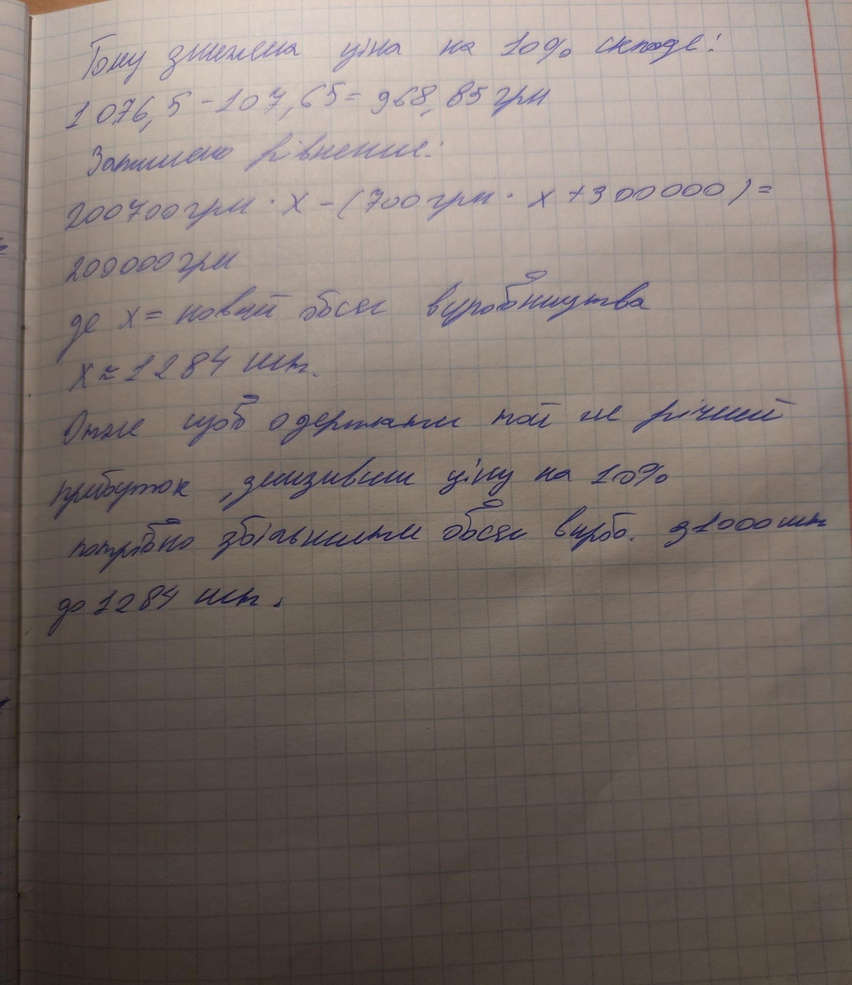 Обчислити, на скільки треба збільшити обсяг виробництва, щоб одержати такий прибуток, знизивши визначену ціну на 10 %.