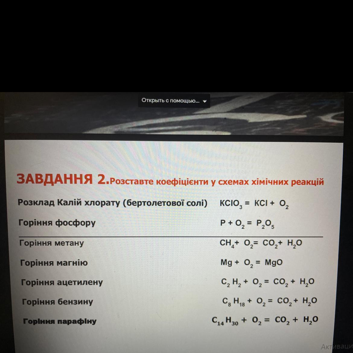 2KClO₃ = 2KCl + 3O₂ — розклад калій хлорату (бертолетової солі)