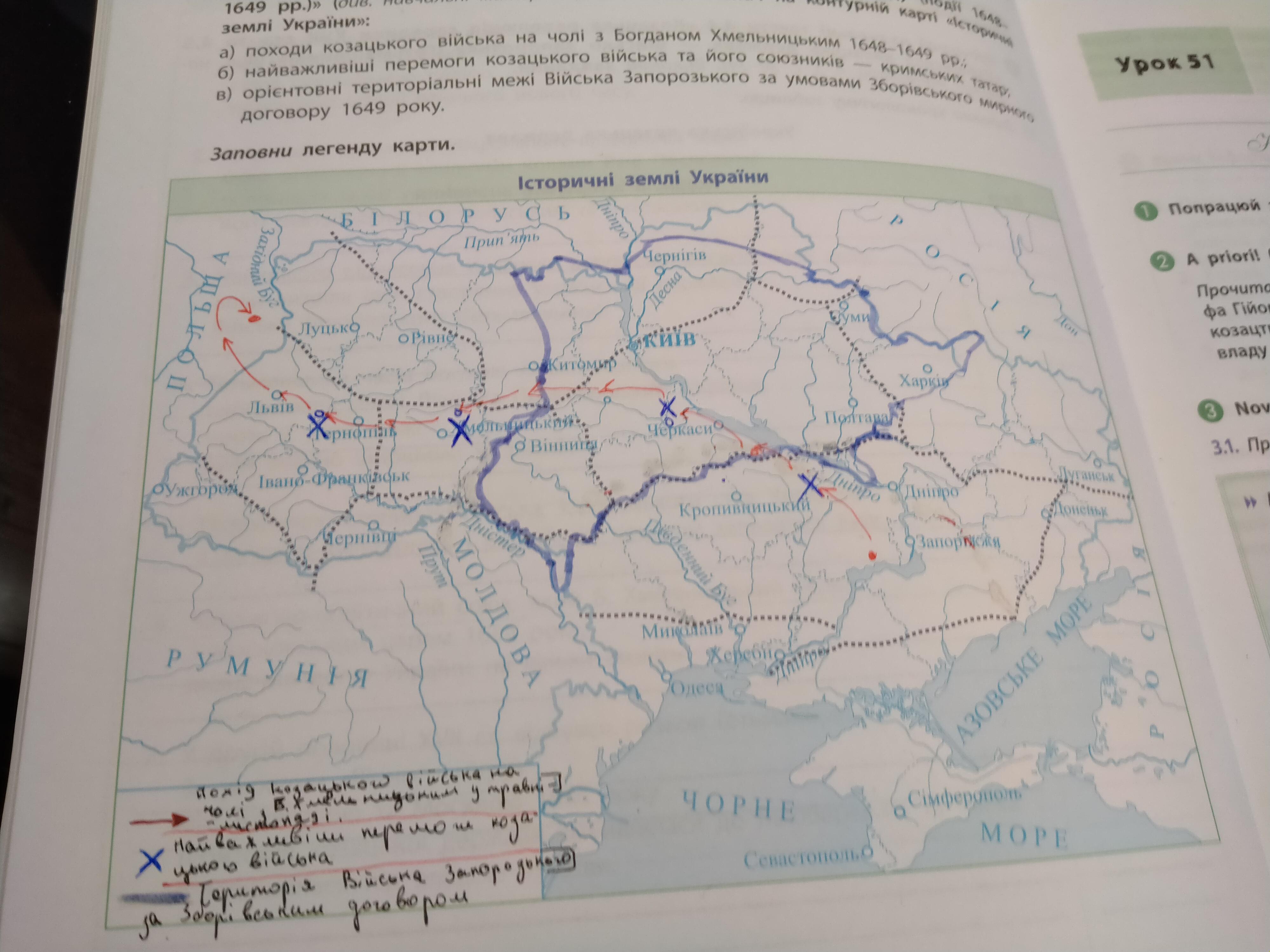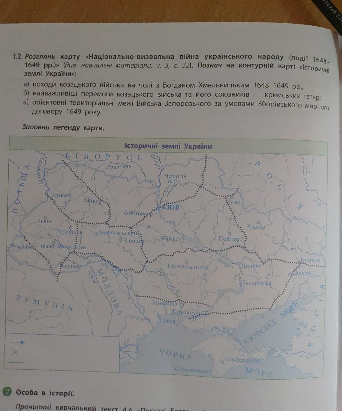 1.2. Розглянь карту «Національно-визвольна війна українського народу (події 1648- 1649 рр.)» (див. навчальні матеріали, ч. 3, с 32). Познач на контурній карті «Історичні землі України»: кримських татар; а) походи козацького війська на чолі з Богданом Хмельницьким 1648-1649 pp.; б) найважливіші перемоги козацького війська та його союзників в) орієнтовні територіальні межі Вiйська Запорозького за умовами зборiвського мирного договору 1649 року. -