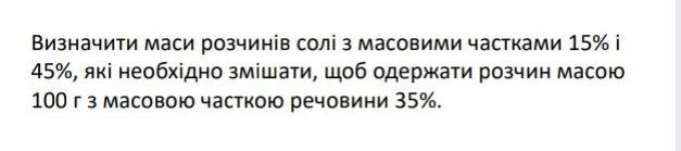 Визначити маси розчинів солі з масовими частками 15% і 45%, які необхідно змішати, щоб одержати розчин масою 100 г з масовою часткою речовини 35%. дайте срочно ответ