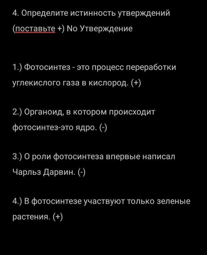 4. Определите истинность утверждений (поставьте +) No Утверждение 1 Фотосинтез - это процесс переработки углекислого газа в кислород .Органоид, в котором происходит фотосинтез-это ядро. О роли фотосинтеза впервые написал Чарльз Дарвин .в фотосинтезе участвуют только зеленые растения .