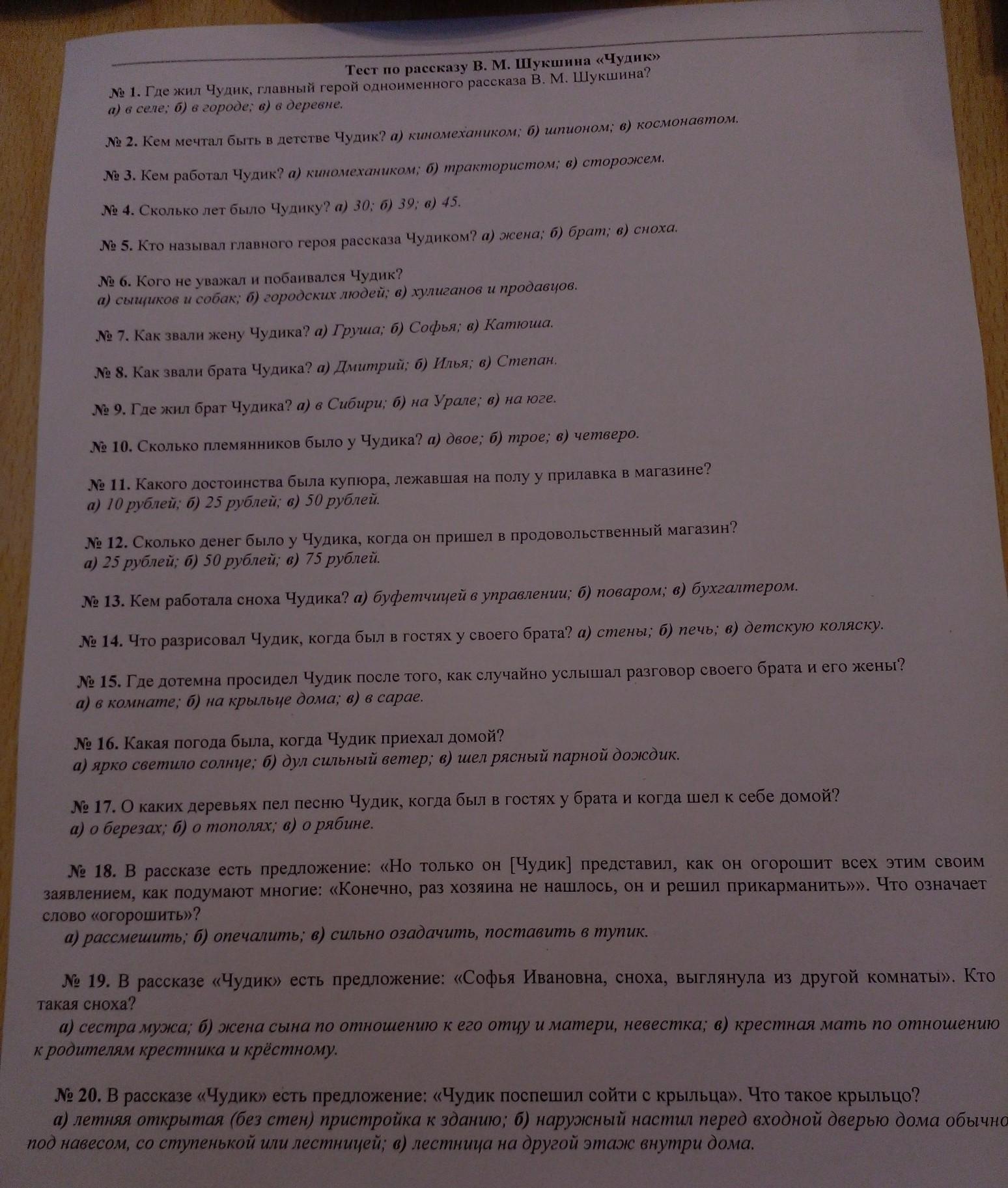 Тест по рассказу В. М. Шукшина «Чудик» № 1. Где жил Чудик, главный герой одноименного рассказа В. М. Шукшина, a) в селе; б) в городе; в) в деревне. № 2. Кем мечтал быть в детстве Чудик? а) киномехаником; б) шпионом; в) космонавтом. № 3. Кем работал Чудик? а) киномехаником; б) трактористом; в) cмopожем. № 4. Сколько лет было Чудику? а) 30; б) 39; в) 45. № 5. Кто называл главного героя рассказа Чудиком? а) жена; б) брат; в) сноха. № 6. Кого не уважал и побаивался Чудик? a) сыщиков и собак; б) городских людей; в) хулиганов и продавцов. № 7. Как звали жену Чудика? а) Груша; б) Софья; в) Катюша. № 8. Как звали брата Чудика? а) Дмитрий; б) Илья; в) Степан. № 9. Где жил брат Чудика? а) в Сибири; б) на Урале; в) на юге. № 10. Сколько племянников было у Чудика? а) двое; б) трое; в) четверо. № 11. Какого достоинства была купюра, лежавшая на полу у прилавка в магазине? a) 10 рублей; б) 25 рублей; в) 50 рублей. № 12. Сколько денег было у Чудика, когда он пришел в продовольственный магазин? a) 25 рублей; б) 50 рублей; в) 75 рублей. № 13. Кем работала сноха Чудика? а) буфетчицей в управлении; б) поваром; в) бухгалтером. № 14. Что разрисовал Чудик, когда был в гостях у своего брата? а) смены; б) печь; в) детскую коляску. № 15. Где дотемна просидел Чудик после того, как случайно услышал разговор своего брата и его жены? а) в комнате; б) на крыльце дома; в) в сарае. № 16. Какая погода была, когда Чудик приехал домой? а) ярко светило солнце; б) дул сильный ветер; в) шел рясный парной дождик. № 17. О каких деревьях пел песню Чудик, когда был в гостях у брата и когда шел к себе домой? а) о березах; б) о мополях; в) о рябине. № 18. В рассказе есть предложение: «Но только он [Чудик] представил, как он огорошит всех этим своим заявлением, как подумают многие: «Конечно, раз хозяина не нашлось, он и решил прикарманить». Что означает слово «огорошить»? а) рассмешить; б) опечалить; в) сильно озадачить, поставить в тупик. № 19. В рассказе «Чудик» есть предложение: «Софья Ивановна, сноха, выглянула из другой комнаты». Кто такая сноха? а) сестра мужа; б) жена сына по отношению к его отцу и матери, невестка; в) крестная мать по отношению к родителям крестника и крёстному. № 20. В рассказе «Чудик» есть предложение: «Чудик поспешил сойти с крыльца». Что такое крыльцо, а) летняя открытая (без стен) пристройка к зданию; б) наружный настил перед входной дверью дома обычно под навесом, со ступенькой или лестницей; в) лестница на другой этаж внутри дома.