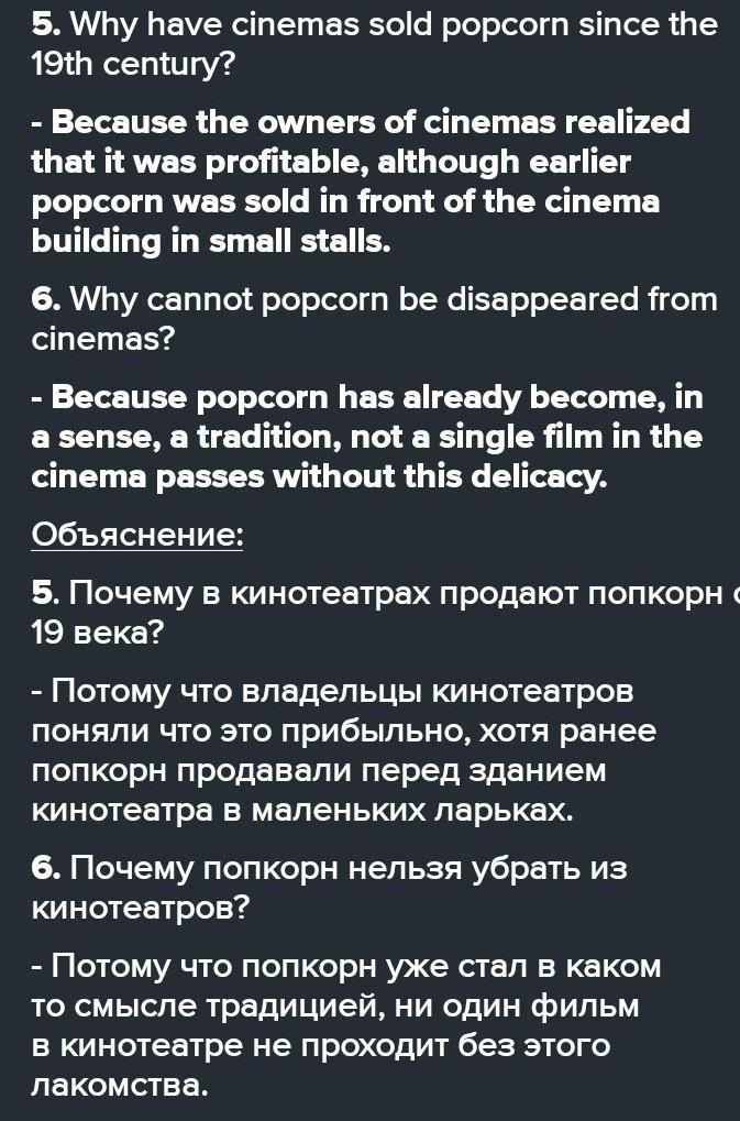 Task. Answer the questions. 5. Why have cinemas sold popcorn since the 19th century? 6. Why cannot popcorn be dissapperead from cinemas?