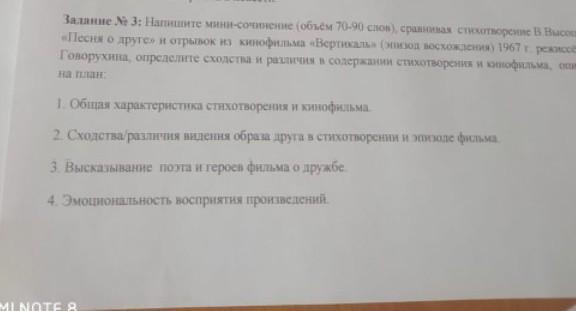 З № 3: Напишите мини-сочинение (обьем 70-90 слов), сравнивая стихотворение в выс «Песня о друге» и отрывок из кинофильма «Вертикаль (эпизод восхождения) 1967 г. режиссера Говорухина, определите сходства и различия в содержании стихотворения и киноф 1. Общая характеристика стихотворения и кинофильма 2. Сходства/различия видення образа друга в стихотворении и эпизоде фильма. 3. Высказывание поэта и героев фильма о дружбе. 4. Эмоциональность восприятия произведений