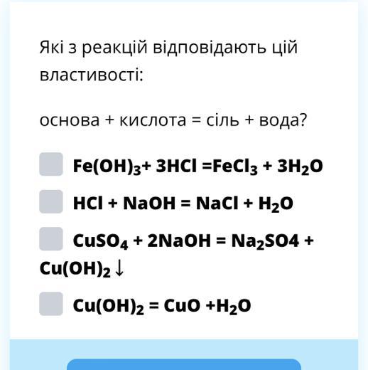 Перша реакція не відповідає цій властивості, оскільки FeCl3 не є сіллю в традиційному розумінні. Вона утворюється в результаті заміщення катіонів заліза в основі на катіони водню з кислоти.