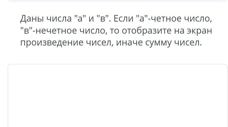 Для решения данной задачи необходимо использовать оператор условия if-else, чтобы проверить четность и нечетность чисел "а" и "в". Если "а" - четное число, а "в" - нечетное, то выводим на экран их произведение, в противном случае - сумму чисел:```