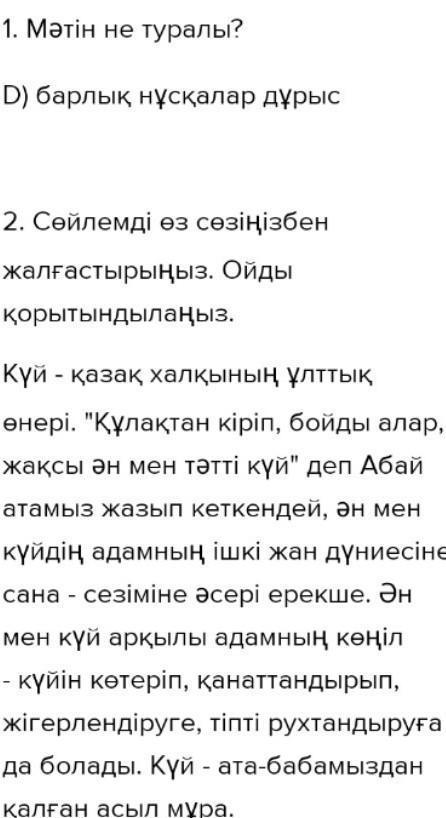 9-тапсырма. «Күй - қазақ халқының ұлттық өнері, олар куаныш пен кайгыны күй арқылы жеткізген» деген пікірмен келісесіз бе? Көтерілген мәселе бойынша эссе жазыңыз.(Сөз саны [10] 85-100 ce3).