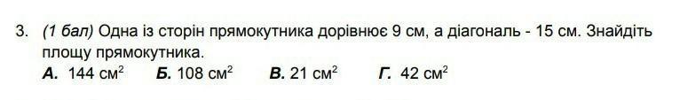 Объяснение: За теоремою Піфагора, якщо a та b - катети прямокутного трикутника, а c - його гіпотенуза, то c^2 = a^2 + b^2. В даному випадку, одна сторона прямокутника (нехай її довжина) a = 9 см, а діагональ (гіпотенуза) c = 15 см.
