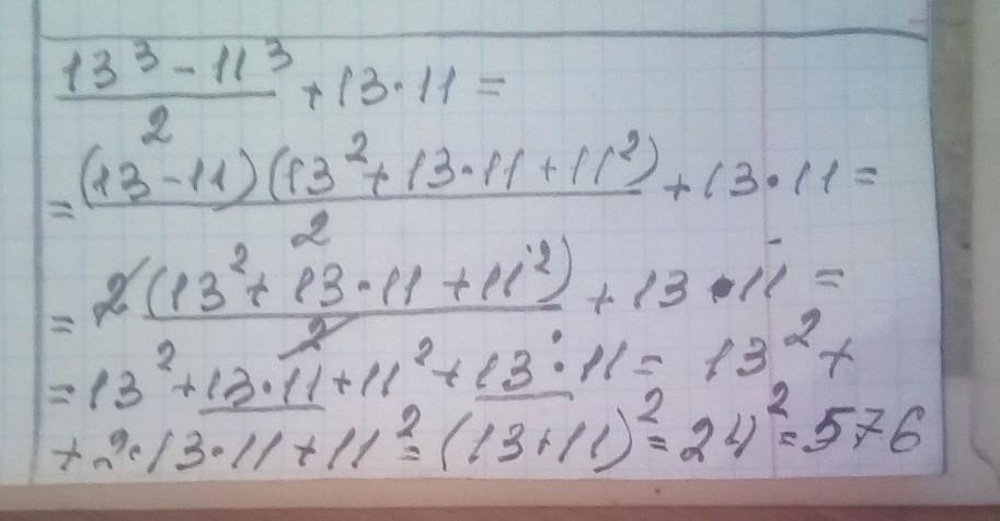 (13³ - 11³)/2 + 13 * 11 = [(13-11)(13² + 1311 + 11²)]/2 + 1311