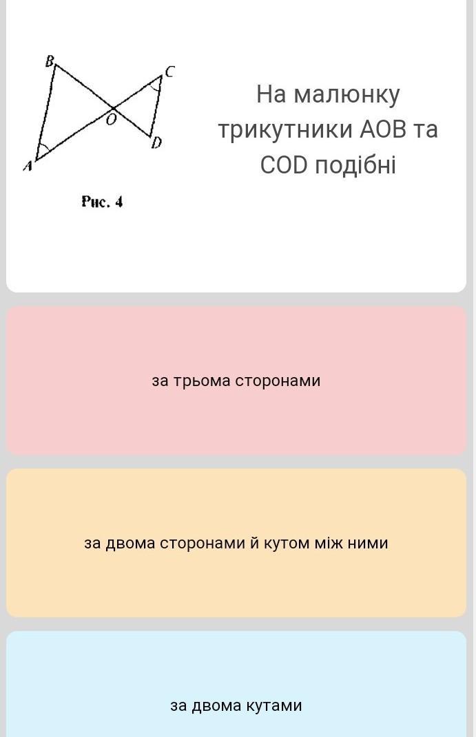 Рис. 4 На малюнку трикутники АОВ та COD подібні за трьома сторонами за двома сторонами й кутом між ними за двома кутами