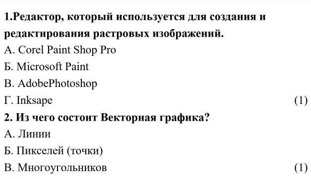 1.Редактор, который используется для создания и редактирования растровых изображений. A. Corel Paint Shop Pro 5. Microsoft Paint Б. B. Adobe Photoshop Г. Inksape 2. Из чего состоит Векторная графика? А. Линии Б. Пикселей (точки) В. Многоугольников (1) (1)