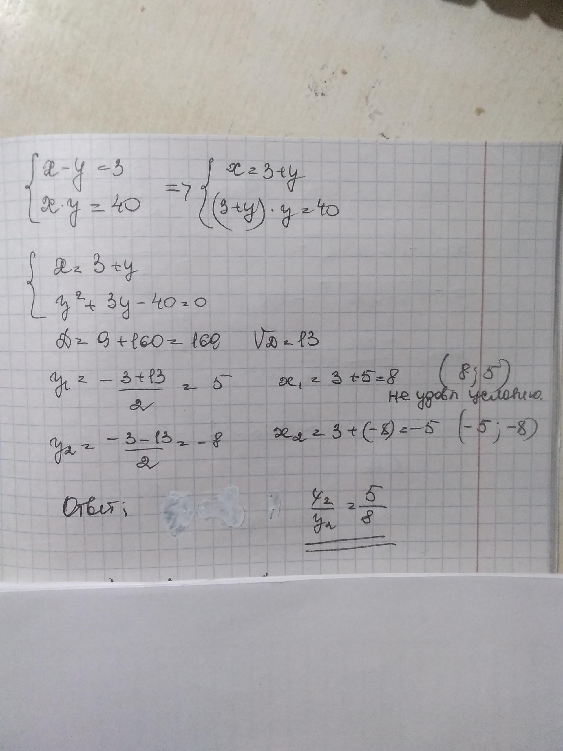 Різниця від'ємних чисел х і у дорівнює 3, а їх добуток дорівнює 40. Запишіть систему рівнянь для визначення х і у. Розв'яжіть цю систему. У відповідь запишіть значення частки x/y