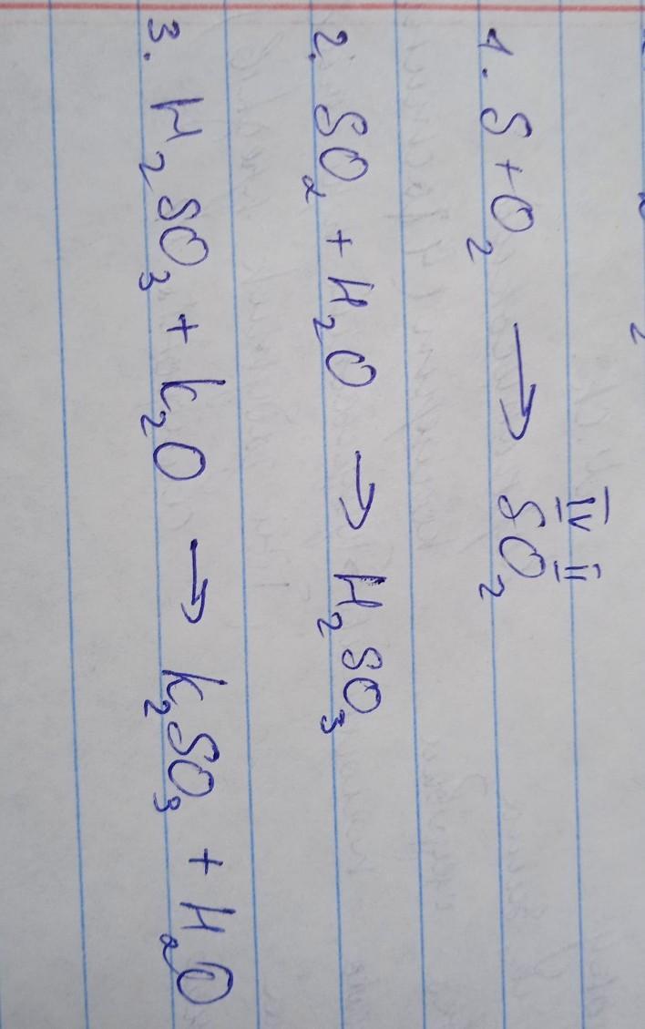 4. Склади рiвняння реакцій, за допомогою яких можна здійснити такі перетворення: S → SO2→ H₂SO3→ K2SO3.