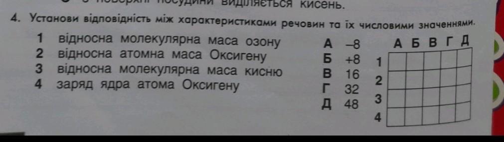 посудини виділяється кисень. 4. Установи відповідність між характеристиками речовин та їх числовими значеннями. А Б В Г Д 1 відносна молекулярна маса озону 2 відносна атомна маса Оксигену 3 вiдносна молекулярна маса кисню 4 заряд ядра атома Оксигену A -8 Б +8 1 В 16 Г 32 Д 48 234