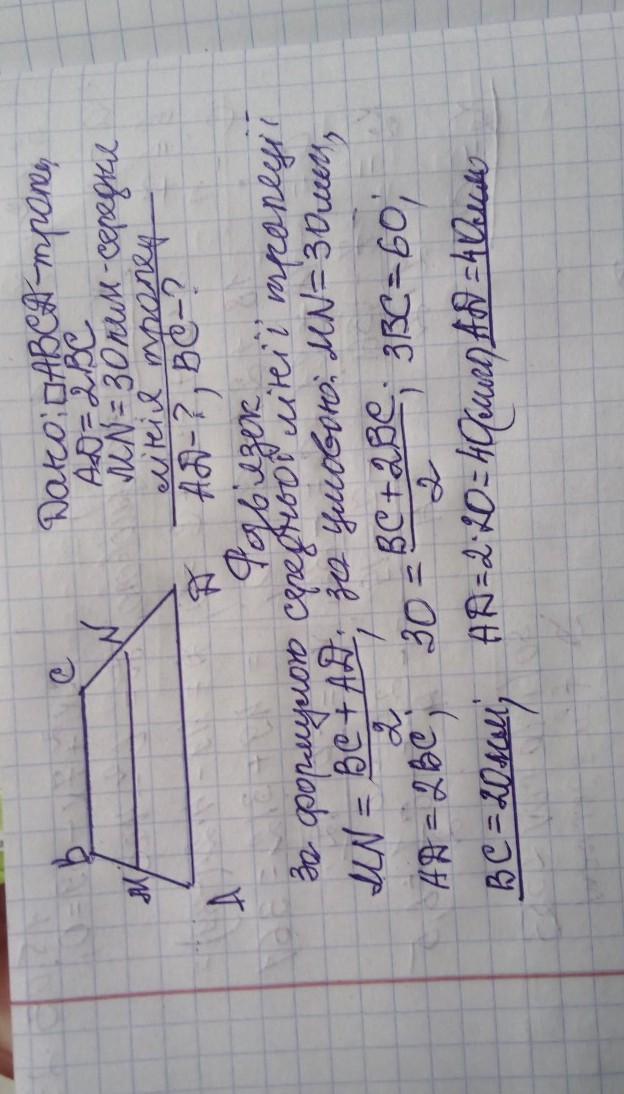 В трапеции ABCD найти длины оснований BC и AD, если AD в два раза больше BC и длина средней линии MN равна 30 мм.