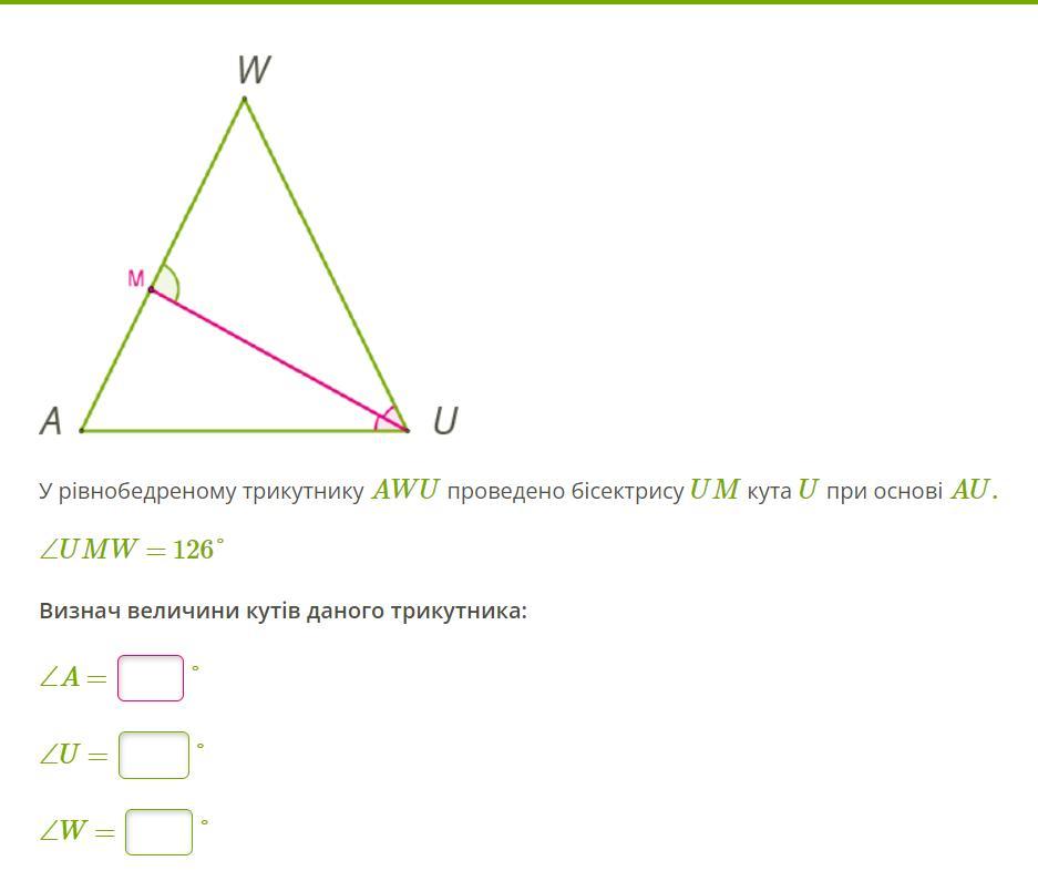 ∠U=∠A=84° кути при основі рівнобедреного трикутника.