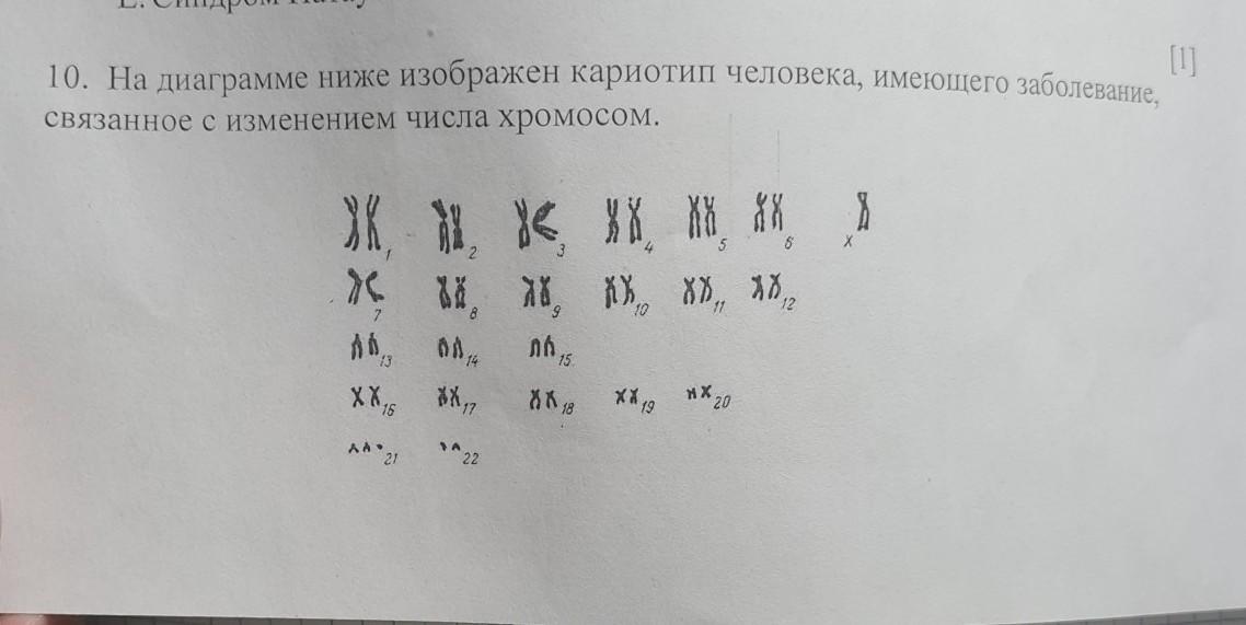 10. На диаграмме ниже изображен кариотип человека, имеющего заболевание, связанное с изменением числа хромосом.