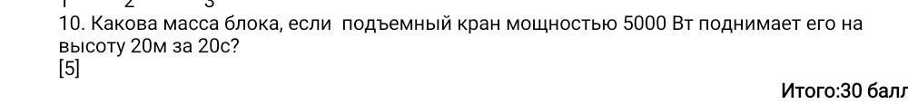 10. Какова масса блока, если подъемный кран мощностью 5000 Вт поднимает его на высоту 20м за 20с? СРОООЧНООО