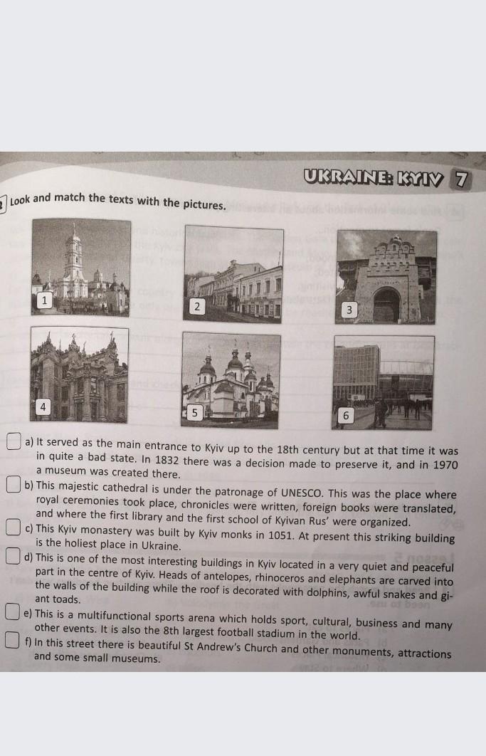 2/Look and match the texts with the pictures. 2 5 3 6 0.9 a) It served as the main entrance to Kyiv up to the 18th century but at that time it was in quite a bad state. In 1832 there was a decision made to preserve it, and in 1970 a museum was created there. b) This majestic cathedral is under the patronage of UNESCO. This was the place where royal ceremonies took place, chronicles were written, foreign books were translated, and where the first library and the first school of Kyivan Rus' were organized. c) This Kyiv monastery was built by Kyiv monks in 1051. At present this striking building is the holiest place in Ukraine. d) This is one of the most interesting buildings in Kyiv located in a very quiet and peaceful part in the centre of Kyiv. Heads of antelopes, rhinoceros and elephants are carved into the walls of the building while the roof is decorated with dolphins, awful snakes and gi- ant toads. e) This is a multifunctional sports arena which holds sport, cultural, business and many other events. It is also the 8th largest football stadium in the world. f) In this street there is beautiful St Andrew's Church and other monuments, attractions and some small museums.