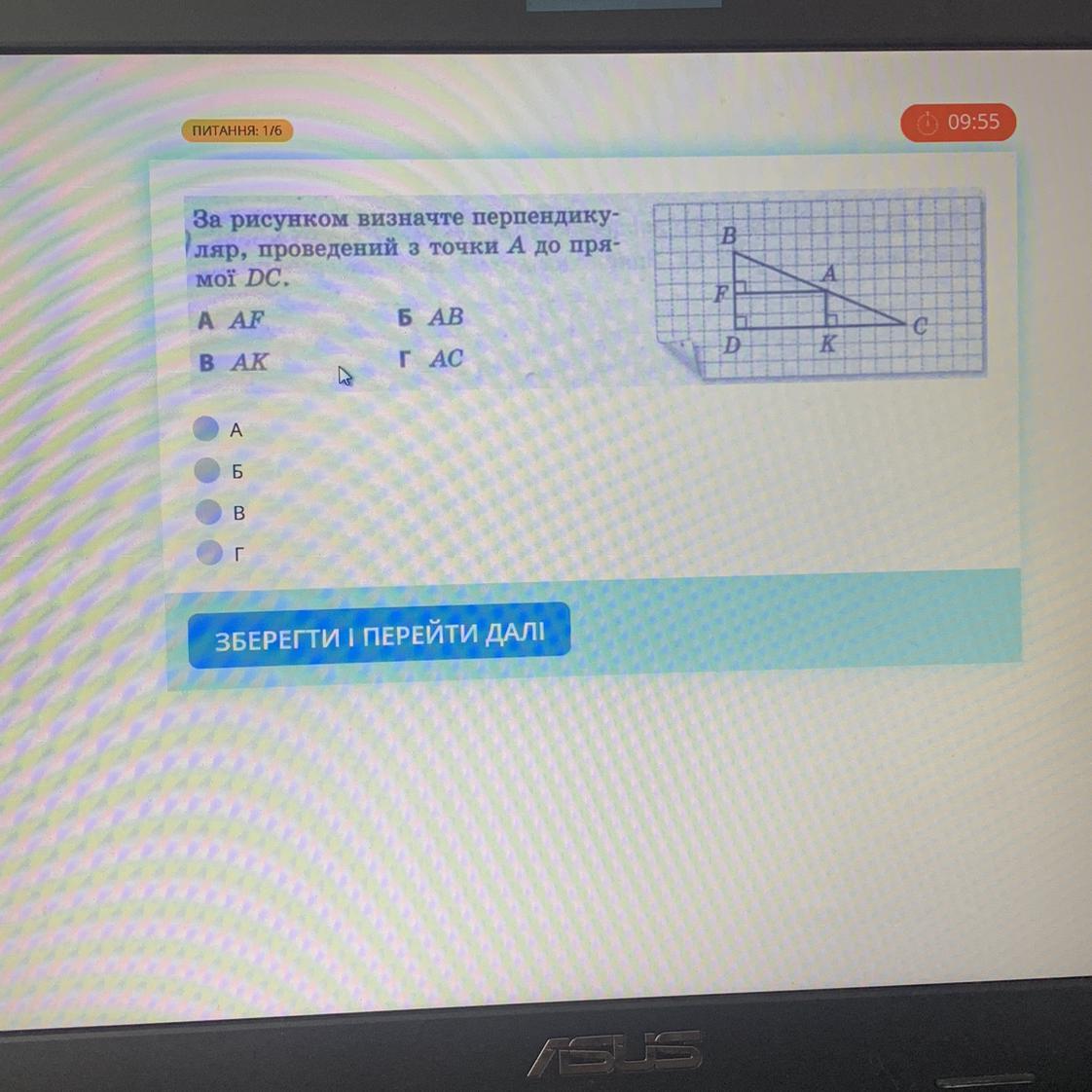 Так как перпендикуляр проведен с точки А, значит, это либо АF либо АК. ещё нам надо то, что перпендикуляр отложен на стороне DC, значит, АК.
