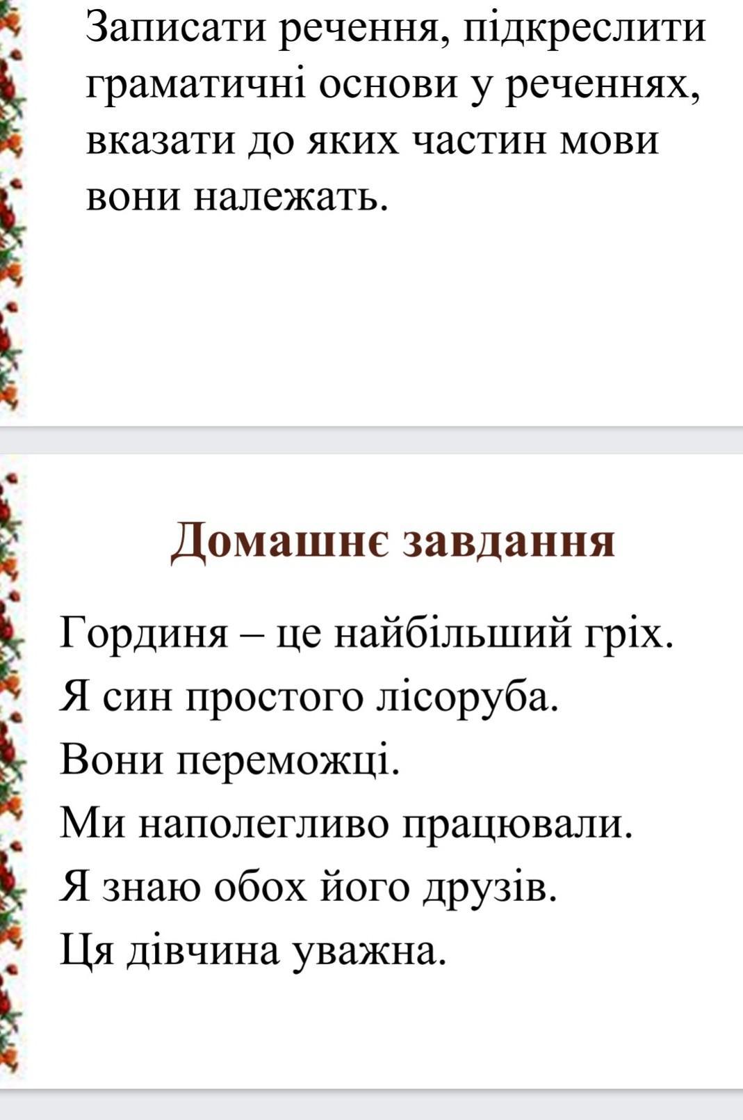 Зписати речення, підкреслити граматичні основи у реченнях,вказати до яких частин мови вони належать. Гординя - це найбільший гріх. Я син простого лісоруба. Вони переможці. Ми наполегливо працювали. Я знаю обох його друзів. Ця дівчина уважна.