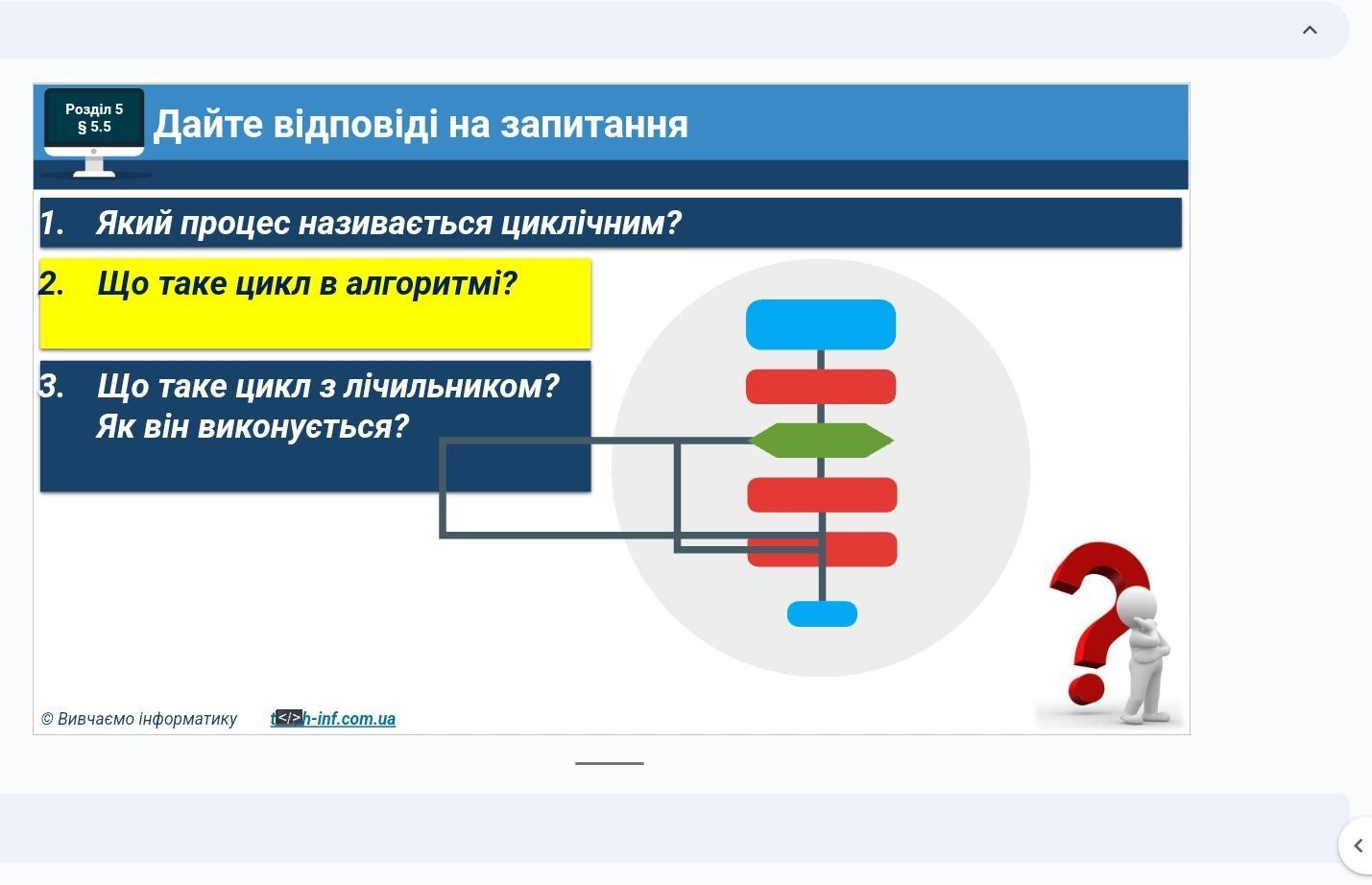 - Фрагмент алгоритму, у якому одна або кілька команд можуть виконуватися більше ніж один раз, називають циклом. Алгоритм, що містить цикл, називають алгоритмом із циклом.