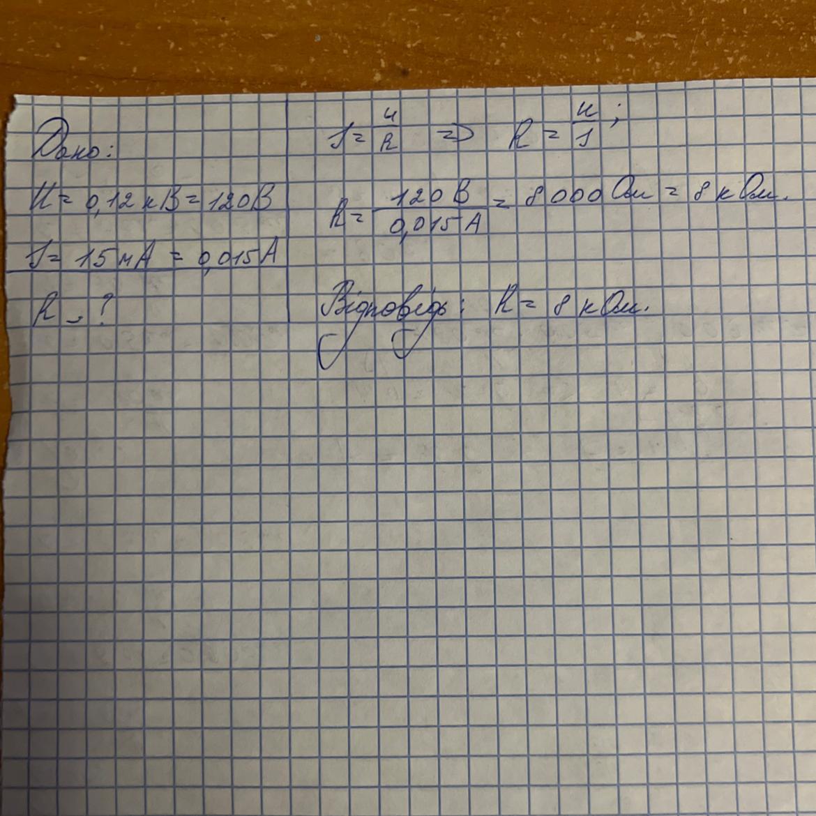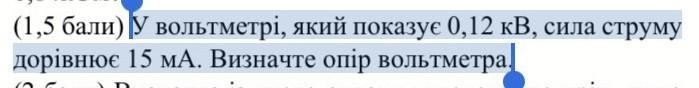 у вольтметрі, який показує 0,12 кВ, сила струму дорівнює 15 мА. Визначте опір вольтметра.