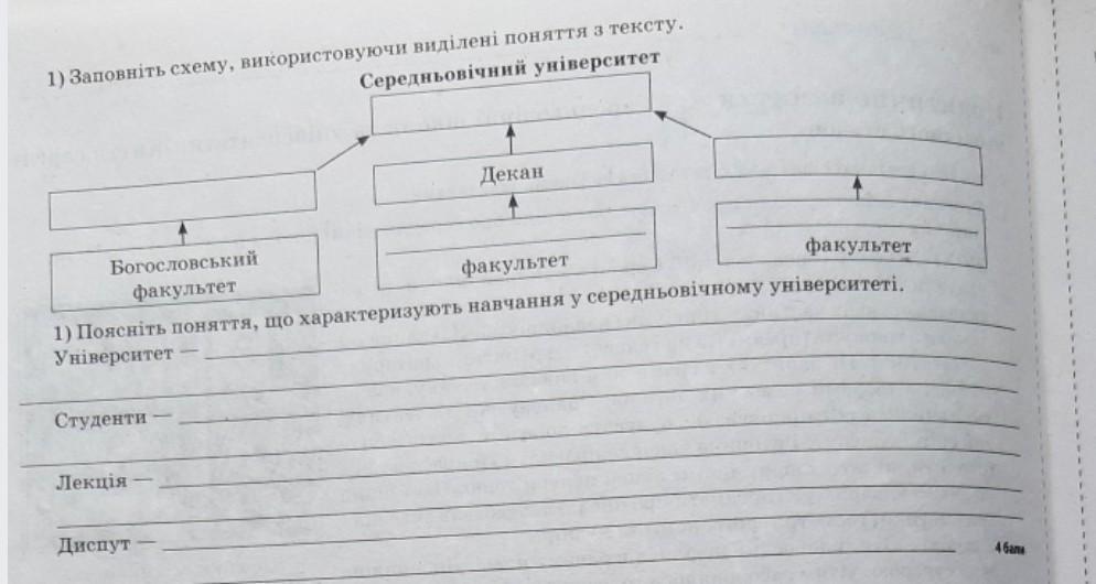 2. Опрацюйте текст про середньовічні університети, заповніть пропуски в схемі та поясніть виділе- НI ПОНЯТТЯ. .У ХІІ-ХІІІ ст. школи в найбільших містах почали перетворюватися на вищі навчальні закла- ди - університети. Перші університети виникли в БолоньЇ (Італія) і Парижі (Франція). Згодом широкої слави набули університети в Кембриджі та Оксфорді (Англія). Наприкінці ХV ст. в Єв- ректорів, са- ропі існувало близько 70 університетів. Університети обирали своїх керівників — мостійно визначали склад викладачів. Університет поділявся на факультети, які очолювали декани. Нижчим», обов'язковим для всіх, був артистичний факультет, де вивчали «сiм вiльних мистецтв». За бажанням студенти могли продовжити навчання на одному з «вищих факультетів - юридичному, медичному або богословському. Підготовка майбутнього юриста або лікаря тривала 5-6 років, а філософа-бого- Заняття називалися лекціями, які читали одягнені у чорну мантію викладачі, а студенти слуха- ли й записували. На лекції відомих професорів збиралися студенти з різних міст Європи. Лекції доповнювалися диспутами - спорами на задану тему, де студенти намагалися переконливо до- вести свою точку зору. Університети були справжнім джерелом знань i вiдiграли важливу роль у культурному розвитку Європи. слова - цілих 15 років.