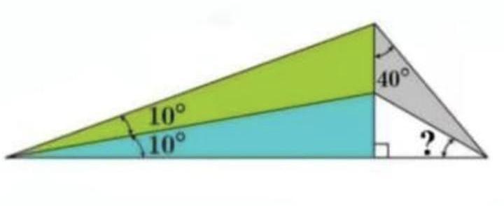 объединим 2 треугольника(белый и серый)в один ,тогда у нас появится один общий угол в 40 градусов. т.к мы знаем,что есть 1 прямой угол(90 градусов),найдем неизвестный угол объединённого треугольника: 90+40=130,