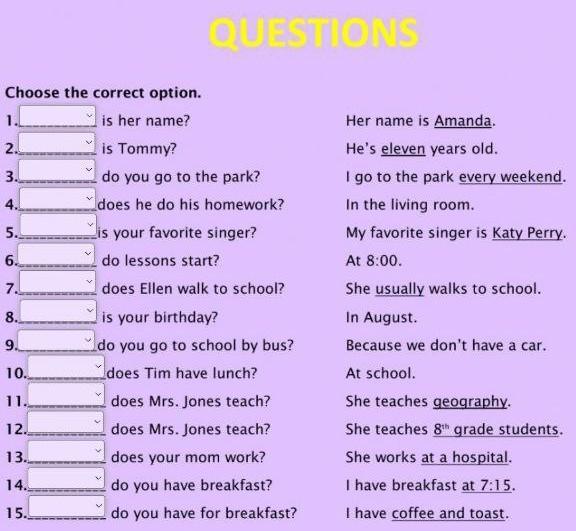 Choose the correct option. is her name? is Tommy? do you go to the park? does he do his homework? is your favorite singer? do lessons start? does Ellen walk to school? is your birthday? do you go to school by bus? does Tim have lunch? 1. 2. 3. QUESTIONS 5. 6. 7. 8. 9. 10. 11. 12. 13. 14. 15. does Mrs. Jones teach? does Mrs. Jones teach? does your mom work? do you have breakfast? do you have for breakfast? Her name is Amanda. He's eleven years old. I go to the park every weekend. In the living room. My favorite singer is Katy Perry. At 8:00. She usually walks to school. In August. Because we don't have a car. At school. She teaches geography. She teaches 8th grade students. She works at a hospital. I have breakfast at 7:15. I have coffee and toast.