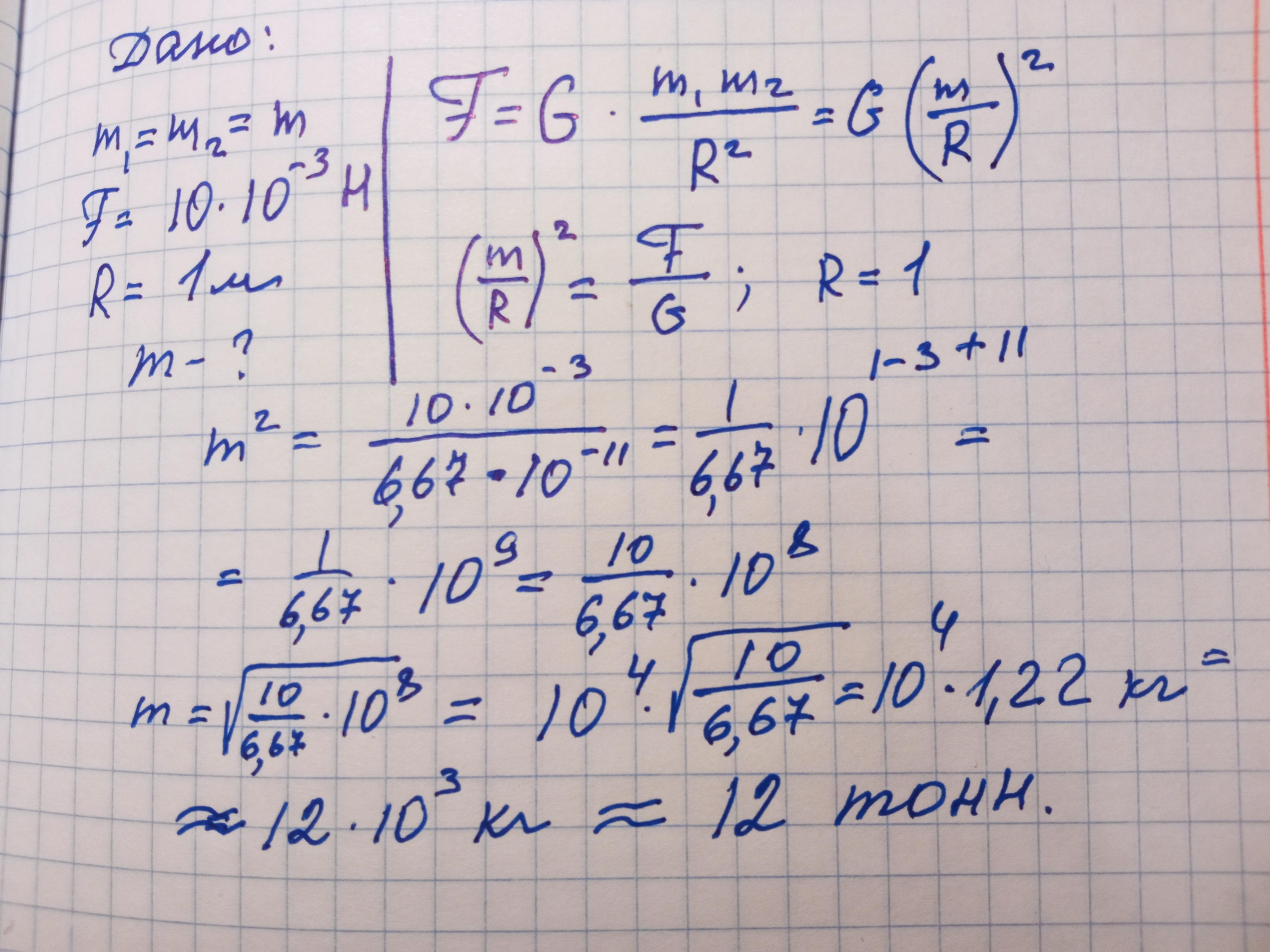 Гравітаційна сила, що двє на дві однакові кульки 10мH. Знайти маси кіл, якщо відстань між їх центрами 100 см