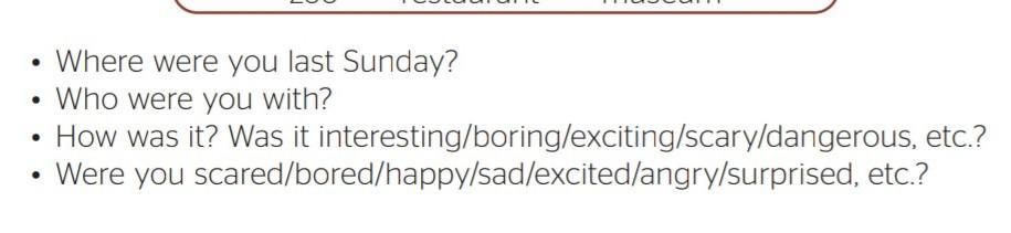 S? 5 Write Write a few sentences about where you were last Sunday. Use the ideas in the box and the questions given. ● cinema park festival party restaurant ZOO museum • Where were you last Sunday? • Who were you with? How was it? Was it interesting/boring/exciting/scary/dangerous, etc.? Were you scared/bored/happy/sad/excited/angry/surprised, etc.? помогиииитттеее