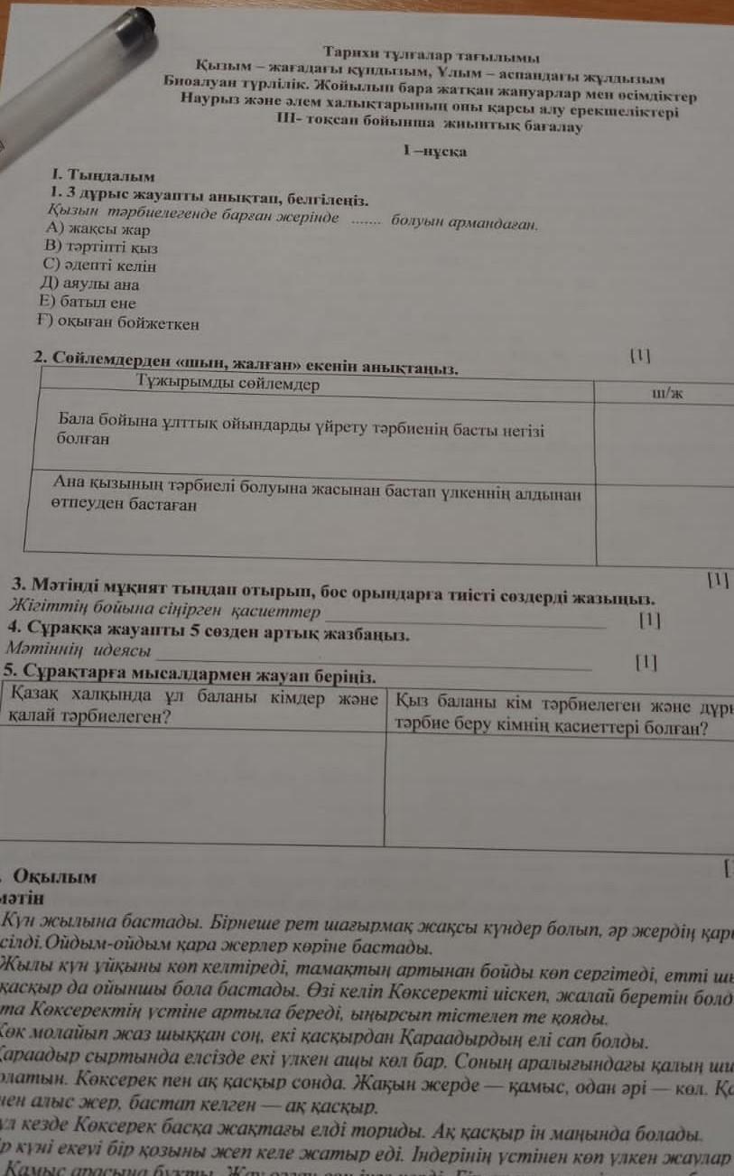 I. Тындалым 1. 3 дурыс жауапты аныктап, белгiленiз. Кызын тәрбиелегенде барган жерінде А) жаксы жар В) тәртiптi кыз С) әдептi келiн Д) аяулы ана Е) батыл ене F) окыган бойжеткен болуын армандаган. 2. Сойлемдерден «шын, жалған» екенін анықтаңыз. Тужырымды сөйлемдер Бала бойына улттык ойындарды үйрету тәрбиенің басты негiзi болган Ана кызынын тәрбиелi болуына жасынан бастап улкеннiн алдынан өтпеуден бастаган 3. Мәтiндi мұқият тындап отырып, бос орындарга тиiстi создердi жазыныз Жігіттің бойына сіңірген қасиеттер Г 4. Суракка жауапты 5 сезден артык жазбаныз. Мәтіннің идеясы 5. Сұрақтарға мысалдармен жауап берініз. Казак халкында ул баланы кiмдер және калай тәрбиелеген? Қыз баланы кім тәрбиелеген тәрбие беру кiмнiн касиеттері б