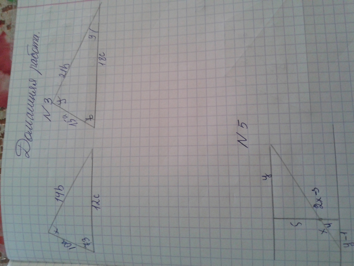 15а/10а=3/2=1,5, 21b/14b=3/2=1.5, 18c/12c=3/2=1.5, сходственные стороны пропорциональны значит треугольники подобны, а в подобных треугольниках соответственные углы равны, z=73 градуса, х=180-(73+9)=98 градусов (если я поняла правильно, а то непонятно 9 или у стоит в углу), 2) треугольники подобны поэтому 5/4=(2х-3)/х, 5х=4(2х-3), 5х=8х-12, 3х=12, х=4, 5/4=у/(у-1), 5(у-1)=4у, 5у-5=4у, у=5 3) треугольники около оснований подобны, 4/х=6/у, 4/6=х/у, х/у=2/3(чего-то не хватает в этой задаче)