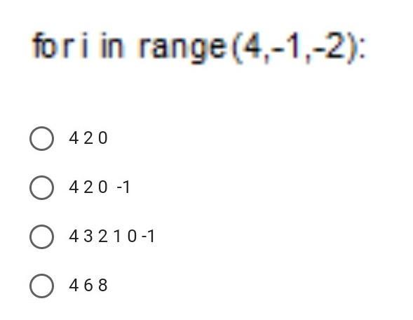 Последовательность чисел, которые выдаст цикл for, будет следующей: 4, 2, 0.