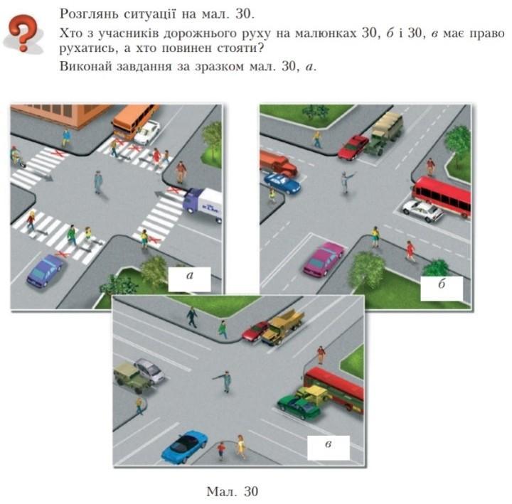 Розглянь ситуації на мал. 30. Хто з учасників дорожнього руху на малюнках 30, б і 30, в має право рухатись, а хто повинен стояти? Виконай завдання за зразком мал. 30, a