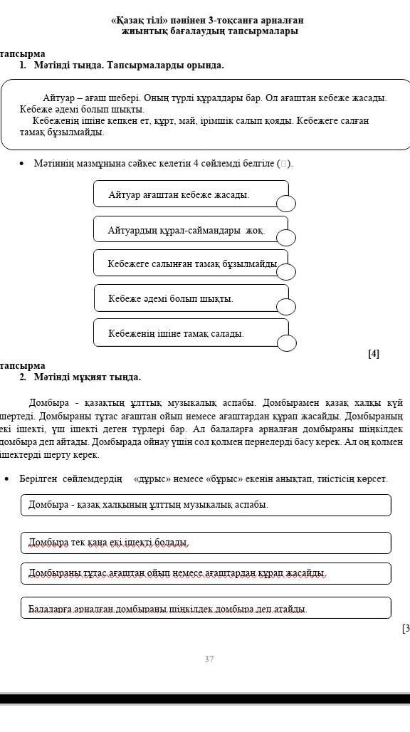 1-тапсырма 1. Мәтiндi тында. Тапсырмаларды орында. > пәнінен 3-тоқсанға арналған жиынтык бағалаудын тапсырмалары Айтуар - ағаш шебері. Оның түрлі кұралдары бар. Ол ағаштан кебеже жасады. Кебеже әдемі болып шықты. Кебеженің ішіне кепкен ет, кұрт, май, iрiмшiк салып кояды. Кебежеге салған тамак бұзылмайды. ● Мәтіннің мазмұнына сәйкес келетін 4 сейлемдi белгiле (0) Айтуар ағаштан кебеже жасады. 2-тапсырма Айтуардын кұрал-саймандары жок. Кебежеге салынган тамак бұзылмайды Кебеже әдемі болып шыкты. Кебеженiң iшiне тамак салады. 2. Мәтiндi мұқият тында. Домбыра - казактын ұлттық музыкалык аспабы. Домбырамен казак халкы күй шертеді. Домбыраны тұтас ағаштан ойып немесе ағаштардан құрап жасайды. Домбыранын екі ішекті, үш ішектi деген түрлері бар. Ал балаларға арналған домбыраны шiнкiлдек домбыра деп айтады. Домбырада ойнау үшiн сол колмен пернелердi басу керек. Ал он колмен ішектердi шерту керек. • Берілген сөйлемдердiн > немесе > екенiн аныктап, тиiстiсiн көрсет. Домбыра-казак халкынын ұлттын музыкалык аспабы. Домбыра тек кана екі шекті болады. Домбыраны тұтас ағаштан ойып немесе ағаштардан құрап жасайды. Балаларға арналган домбыраны шiнкiлдек домбыра деп атайды. [4] 37 [3]