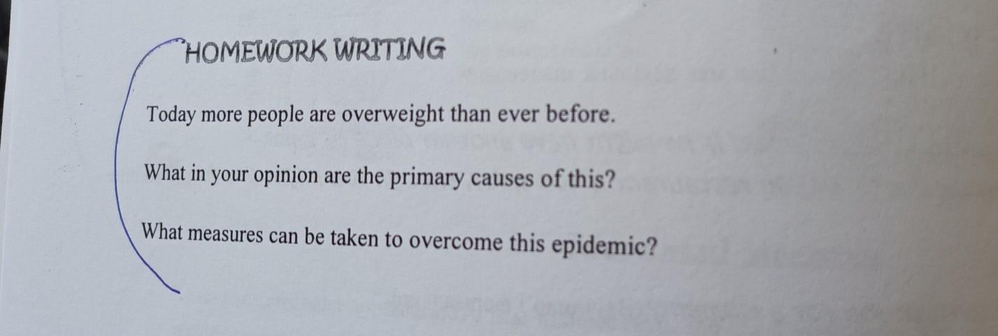 НАПИСАННЯ ДОМАШНЬОГО ЗАВДАННЯ Сьогодні більше людей мають надмірну вагу, ніж будь-коли. Які, на вашу думку, основні причини цього? Які заходи можна вжити для подолання цієї епідемії?