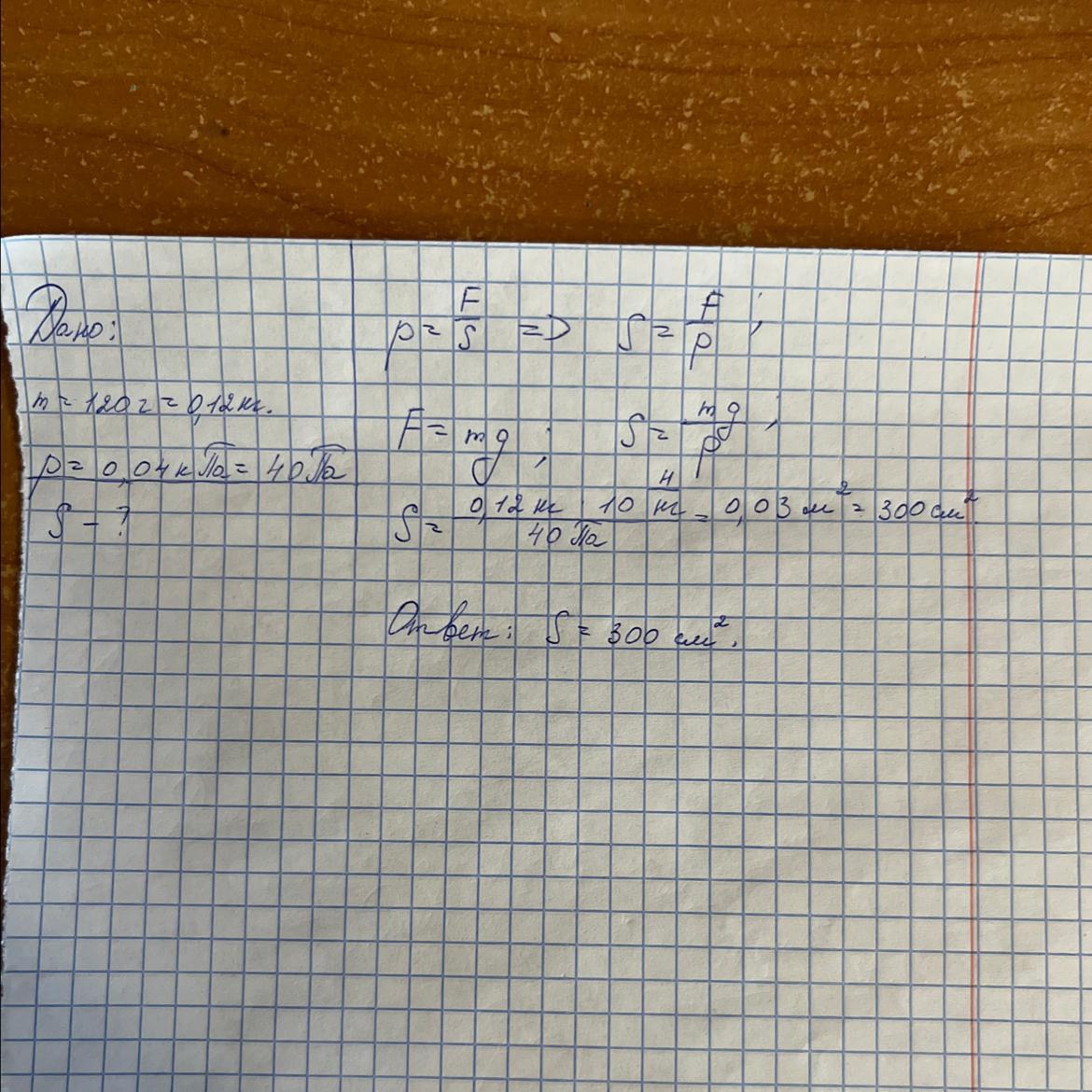 Тело массой 120 г оказывает давление на поверхность 0,04 кПа. Определите площадь опоры тела. Ответ запишите в см2