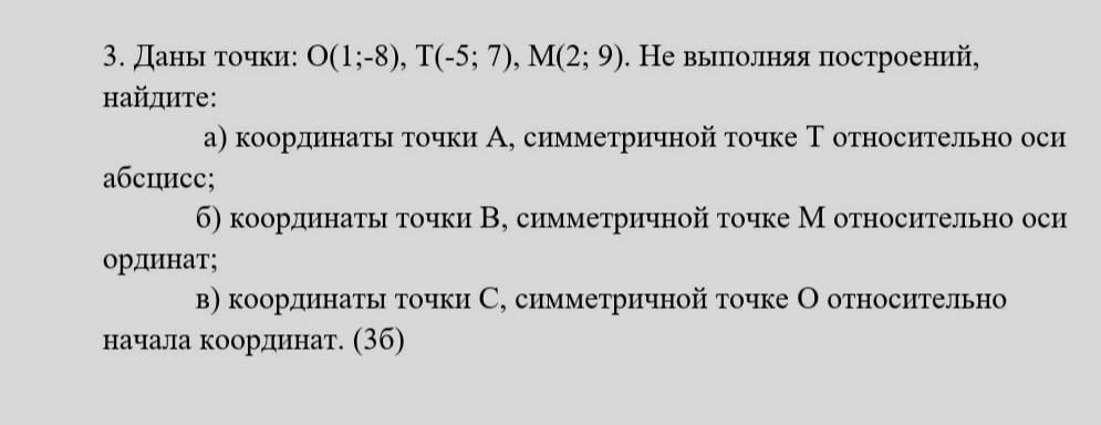 3. Даны точки: 0(1;-8), T(-5; 7), M(2; 9). Не выполняя построений, найдите: а) координаты точки А, симметричной точке Т относительно оси абсцисс; б) координаты точки В, симметричной точке М относительно оси ординат; в) координаты точки С, симметричной точке О относительно начала координат. (36)