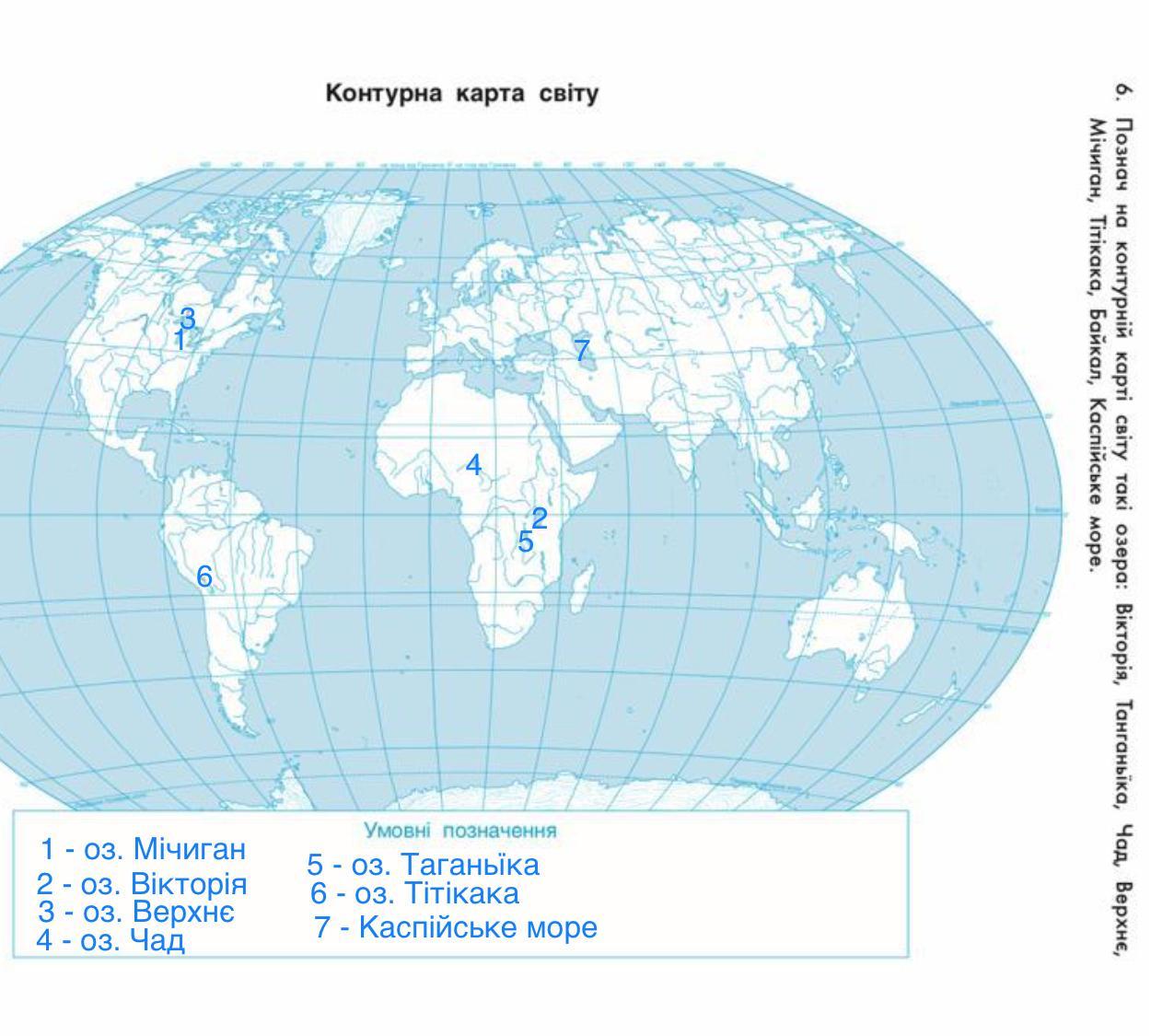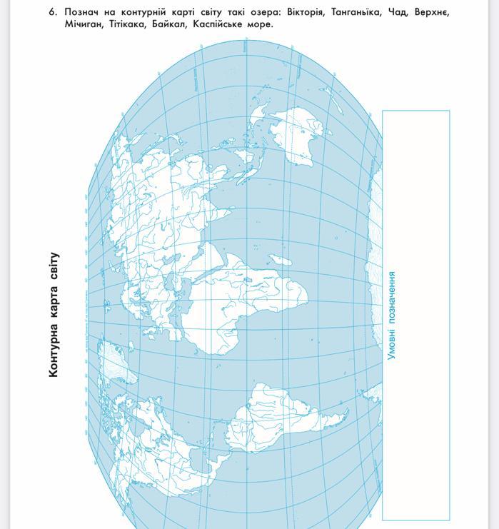 6. Познач на контурній карті світу такі озера: Вікторія, Танганьїка, Чад, Верхнє,