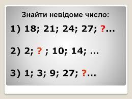 1) 18; 21; 24; 27; 30 6*3=18 7*3=21 8*3=24 9*3=27 10*3=30(числа,начиная с 6 умножаются на 3)