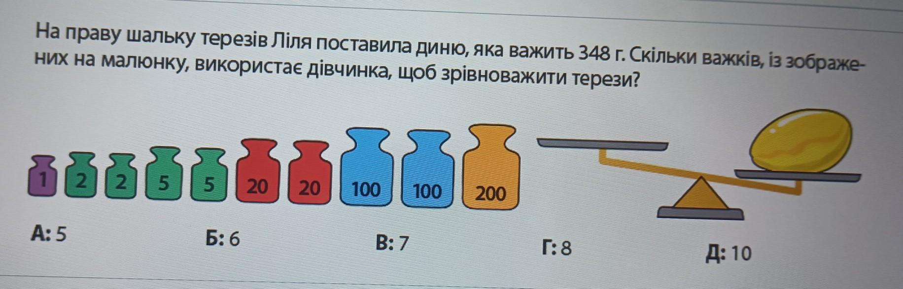 на парову шальку терезів поставили диню яка важить 348 г скільки важків із зображених на малюнку використай дівчина щоб зрівноважити Терези?