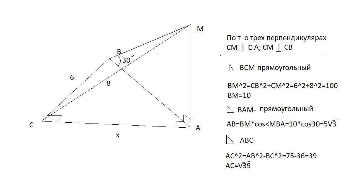 Прямая AM перпендикулярна плоскости треугольника ABC, MC=8 см, BC=6 см, угол BCA=90 градусов, угол между наклонной MB и плоскостью ABC равен 30 градусов. Найдите длину отрезка AC.