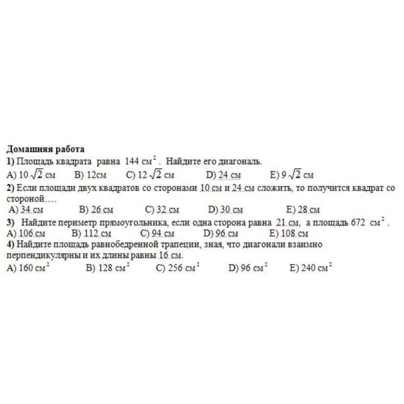 1) Площадь квадрата равна 144 см². Найдите его диагональ.