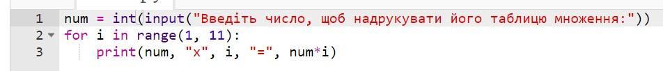 num = int(input("Введіть число, щоб надрукувати його таблицю множення:"))